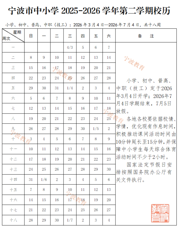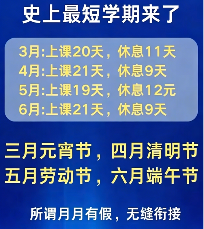 宁波市教导局旧年7月就曾发布了这个学期的校历,网友说:“3月4日开学7月4日学期收尾,满打满算只好18周。裁撤日常周末、春假(1天)、晴朗节(1天)、五一就业节(3天)端午(1天),确实上课的时辰可能80天齐到不了!”