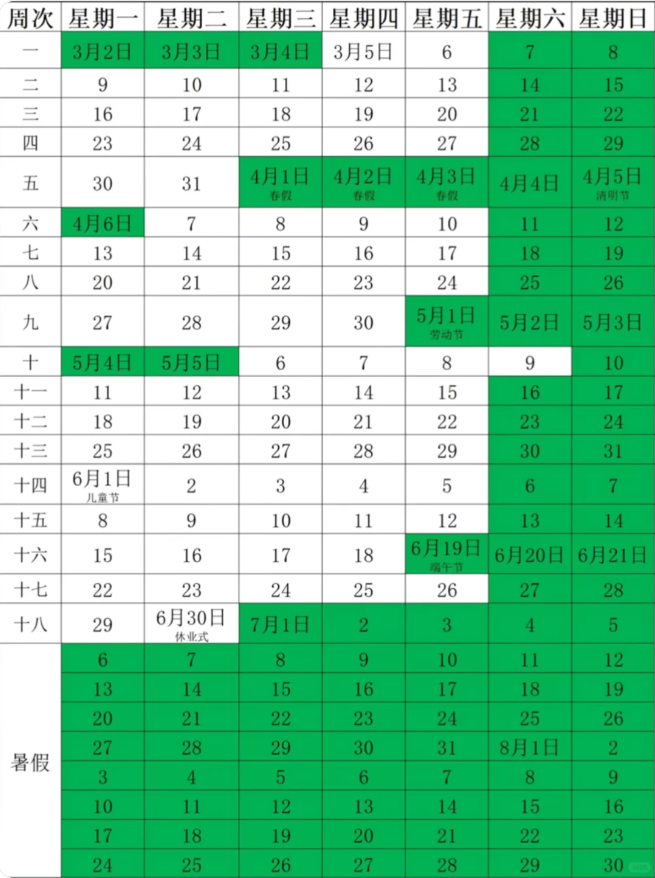 有的地区也曾排出了春假,于是,有网友把春假也列入其中,绘出了极度良好的上课和放沐日期。
