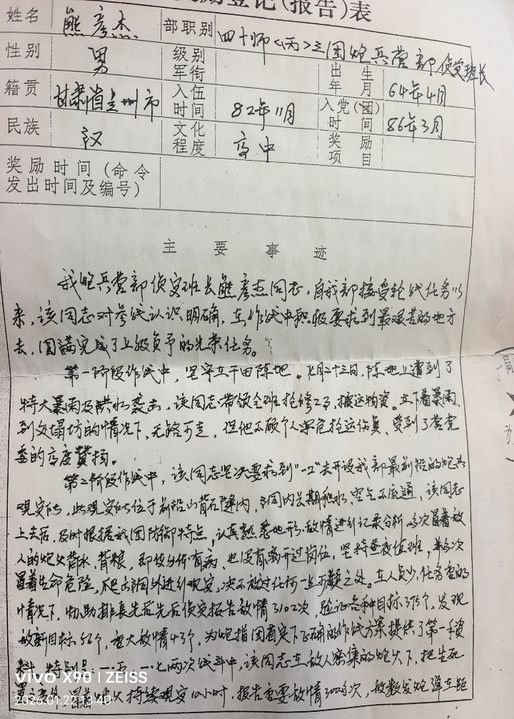 熊彦杰战友脾气轩敞,聪惠伶俐,他是从141师战前调到咱们417团的。他在那拉战场上负二不雅察哨,在这个最危境,最前边的不雅察哨呆了半年技巧,泄露优秀,荣立二等功。
