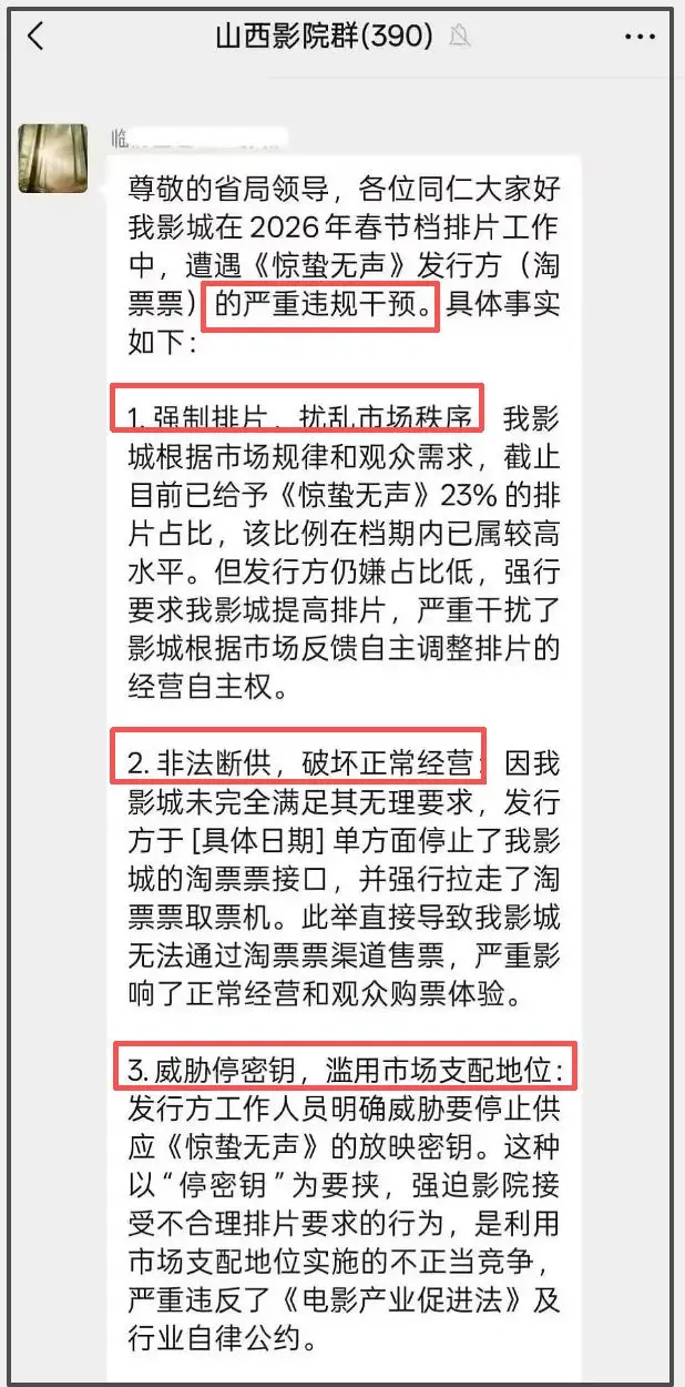 山西一个聚积了 390 位院线负责东谈主的行业群里,一家影城的控诉长文径直引爆了全网:影院按市集划定给了《惊蛰无声》23% 的排片,这个比例在春节档一众影片里也曾属于高位,可淘票票依旧动怒足,强行要求不时加排,直言排片占比 “不够看”。