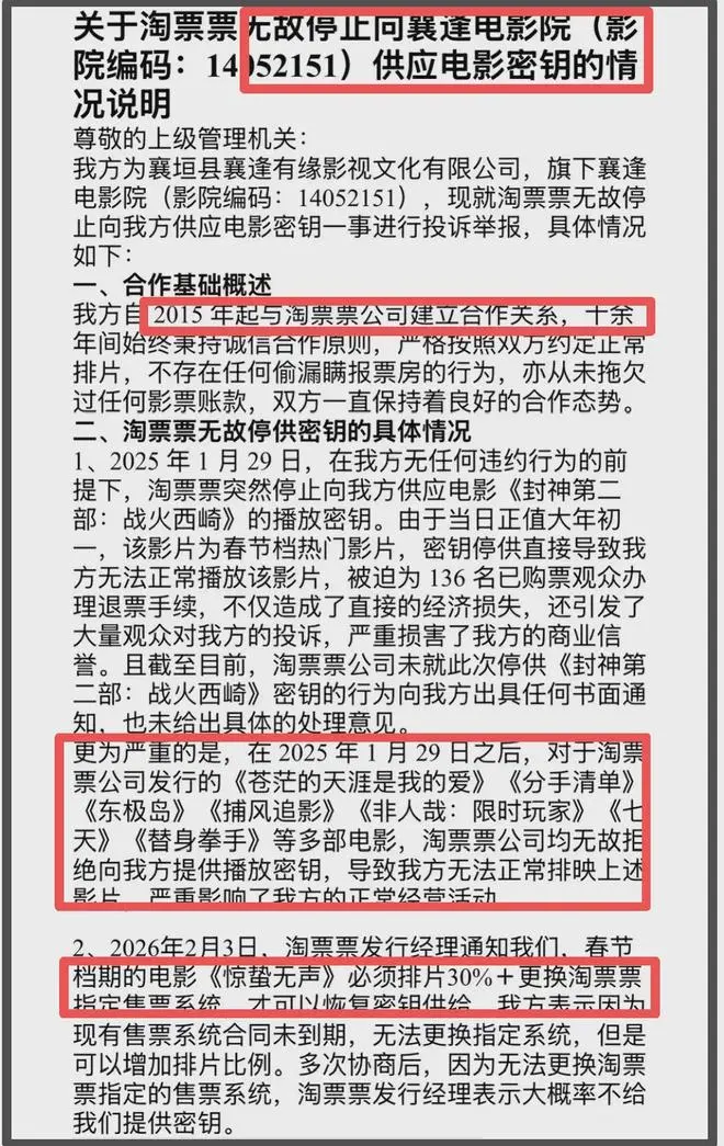 山西襄垣县的襄逢电影院,更是这场霸王操作的直接收害者。这家影院和淘票票配合了整整 11 年,11 年间从没偷漏票房、从没拖欠账款,一直规章程矩配合,后果在 2025 年大年月朔,毫无征兆地被淘票票停发了《封神第二部》的密钥。