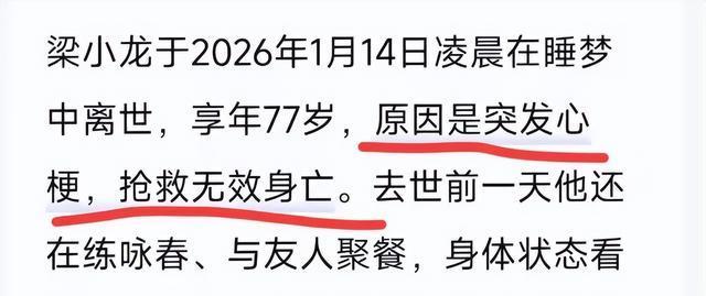 左证知情东谈主的说法是,梁小龙却是病逝,早在2026年1月14日凌晨两点半的时候,他蓦地感到胸口剧烈难堪,难以隐忍。