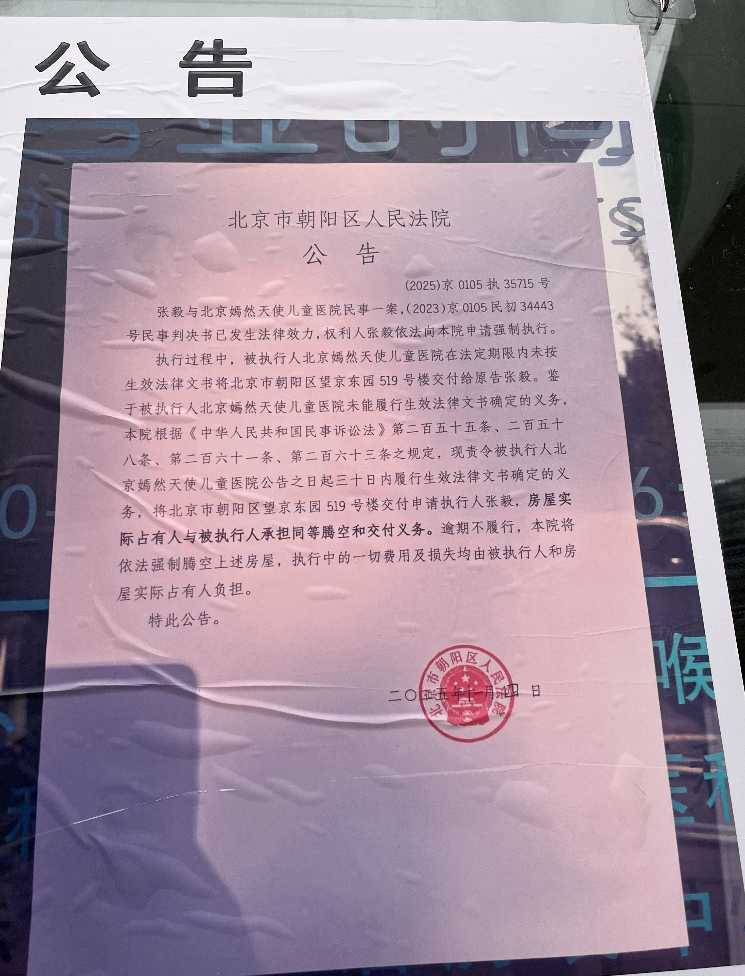 嫣然病院门口的玻璃上贴着法院的公告。 新京报记者 徐鸣 摄