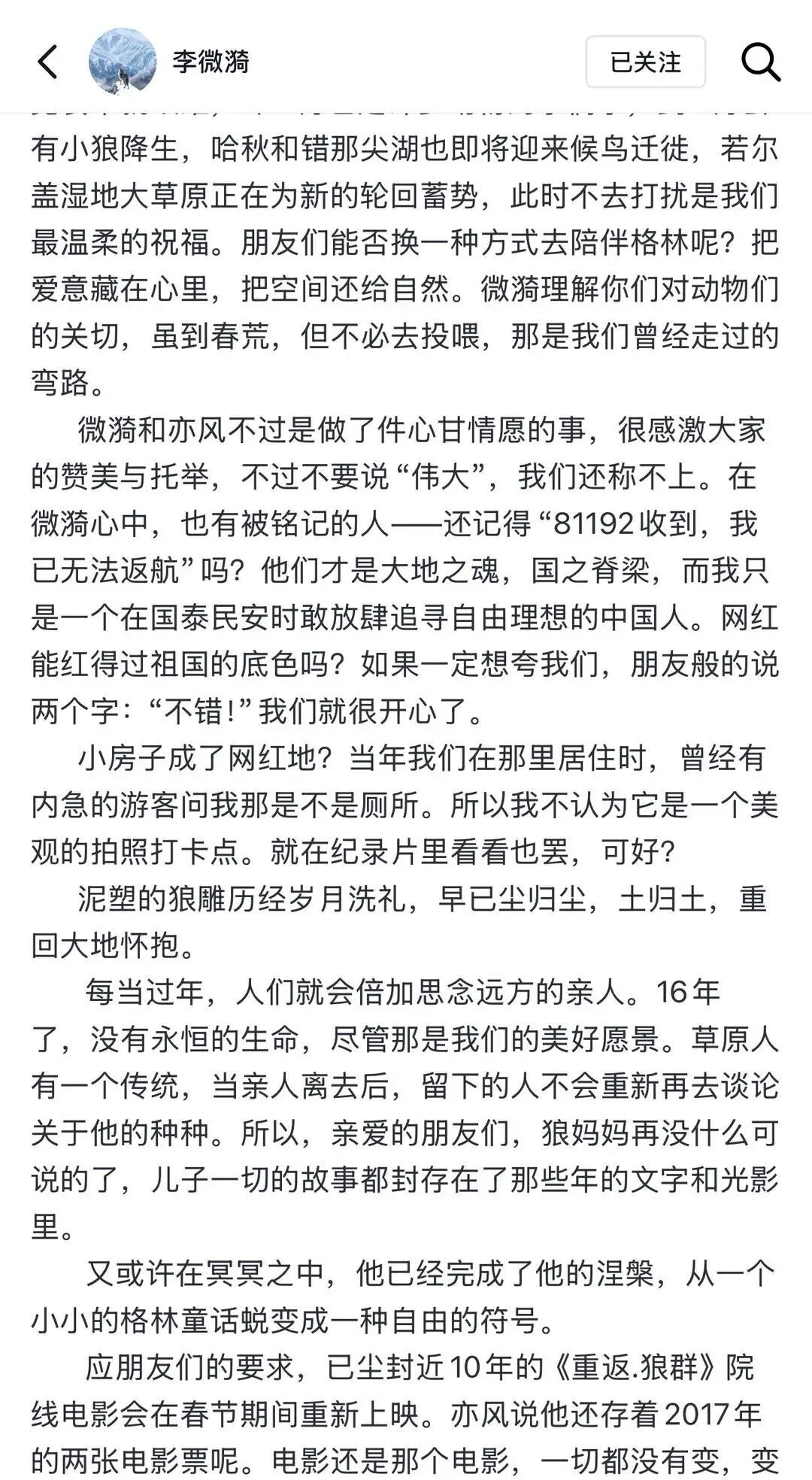 大岁首三,尘封近10年的《重返·狼群》院线电影将重新上映。李微漪对此也颇为感触:“电影照旧阿谁电影,一切都莫得变,变化的是咱们我方。过去在影院里哭喊‘格林不要走’的孩子,刻下长成少年了吧。”